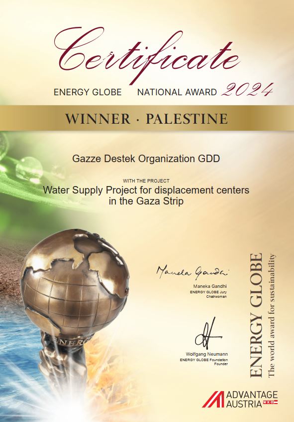 We are pleased to share great news for the year 2024: Gazze Destek Organization has won the Energy Globe Award for 2024 for the “Clean Water Supply Project for Displacement Centers in the Gaza Strip”.