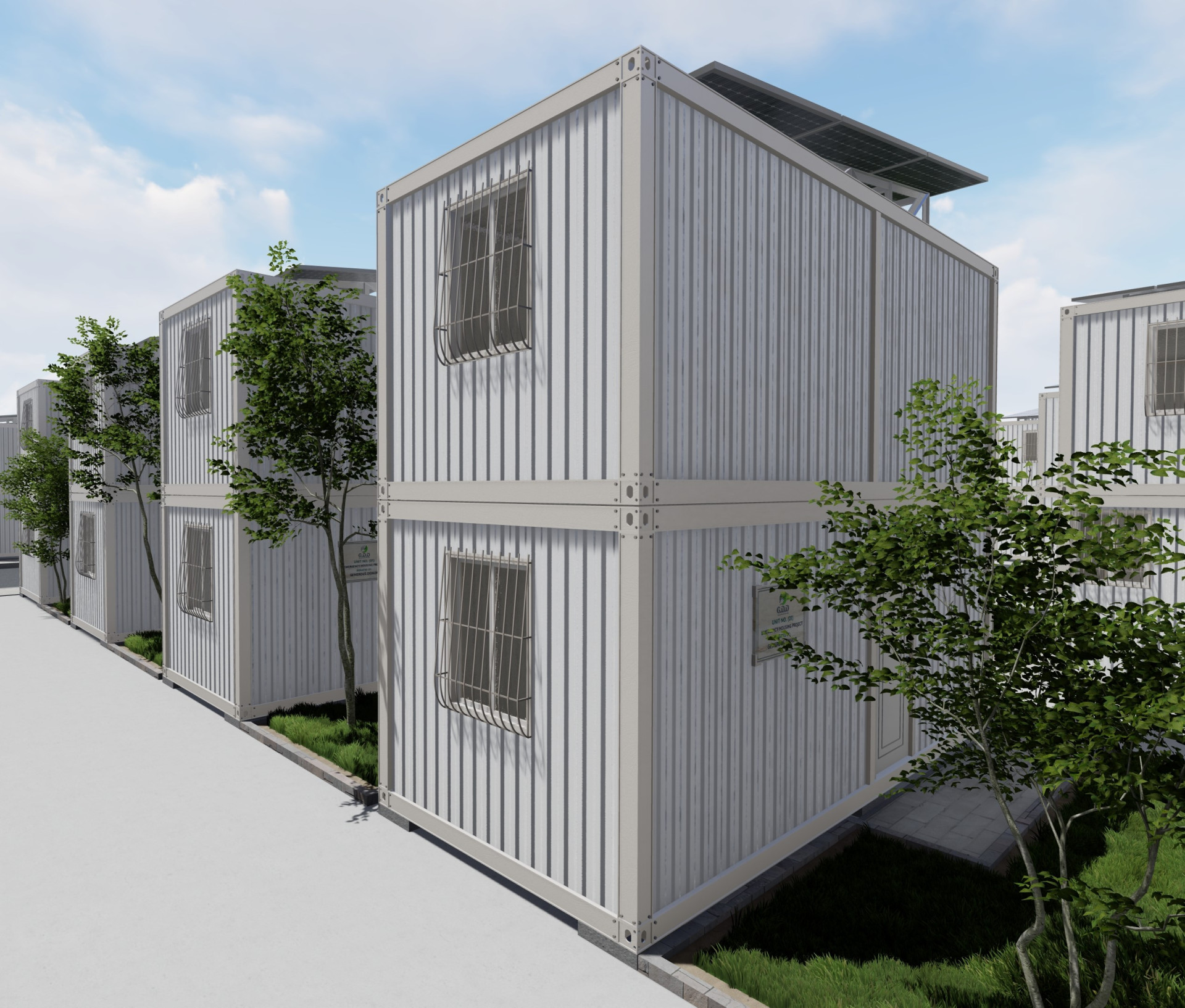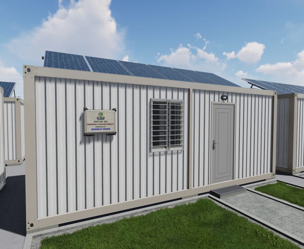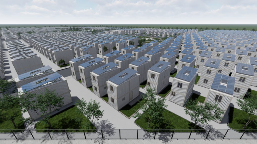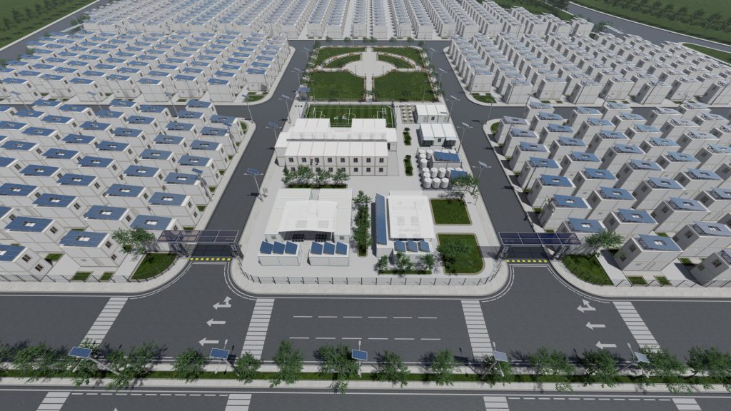 Therefore, we attach a project to establish a green residential city from prefabricated units, totaling 1,000 housing units: 500 units of 42 m² each and 500 units of 21 m² each, with a front area equal to the unit’s size. The project includes a medical center, educational school, well, desalination plant, green spaces, children’s play areas, cafeteria, public restrooms, mosque, commercial shops, and solar power to operate the housing units and city facilities.