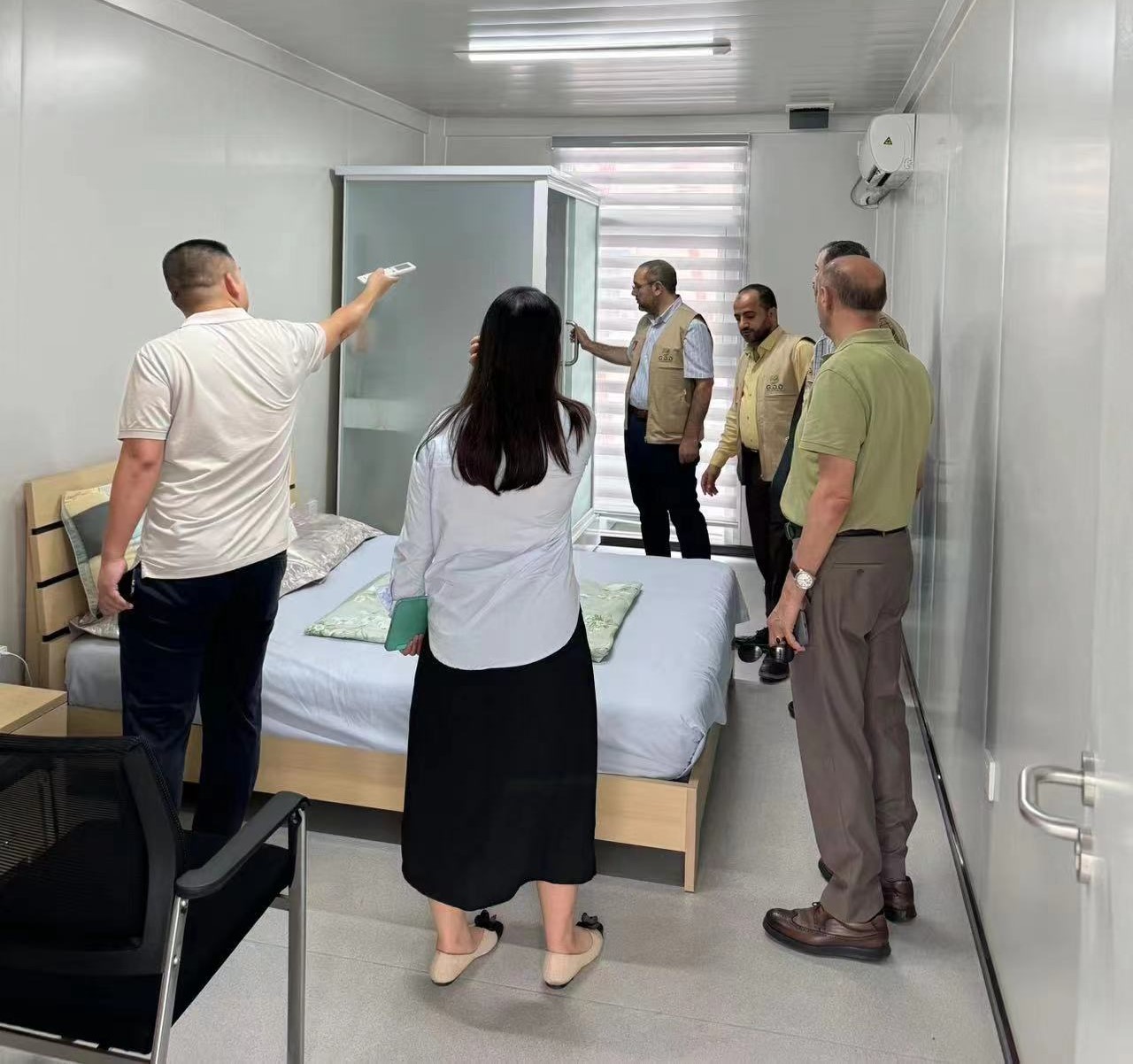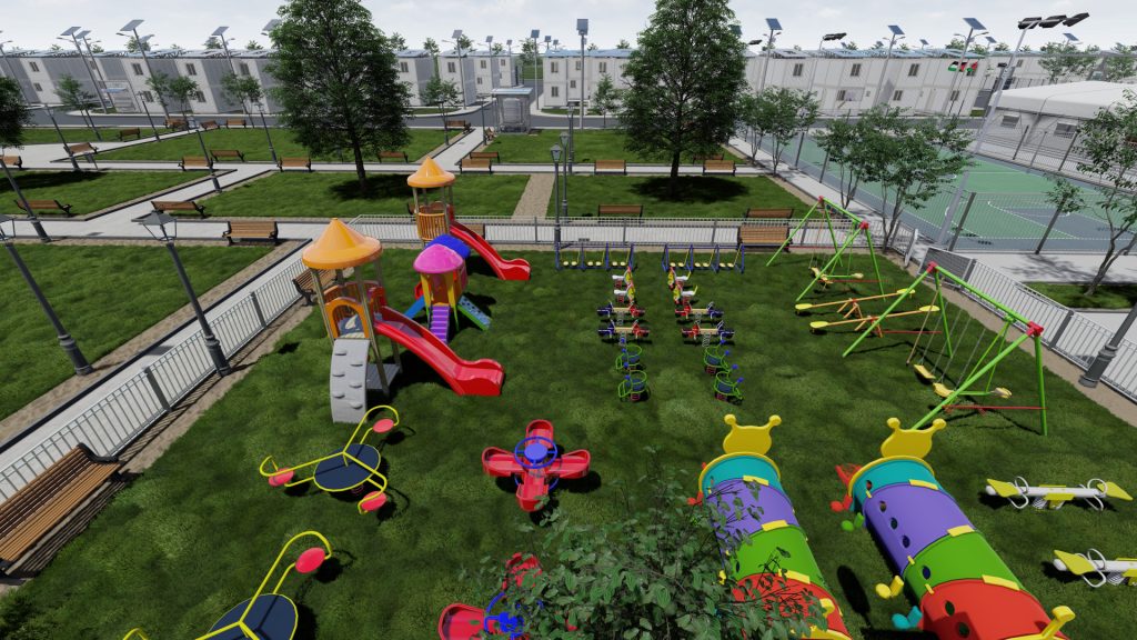 The project includes a medical center, educational school, well, desalination plant, green spaces, children’s play areas, cafeteria, public restrooms, mosque, commercial shops, and solar power to operate the housing units and city facilities.
